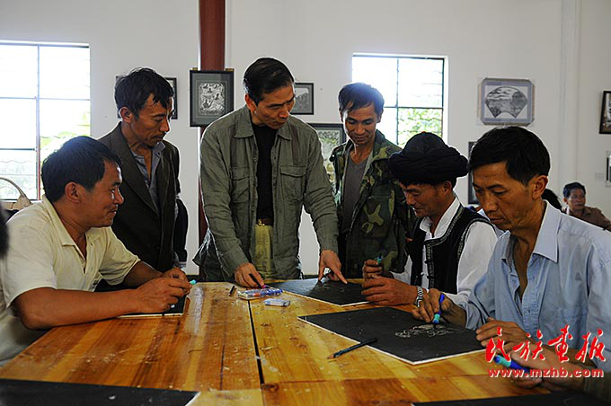 為了提升作品質(zhì)量,阿峨新寨村的版畫(huà)創(chuàng)作者邀請(qǐng)專家對(duì)其進(jìn)行藝術(shù)指導(dǎo)