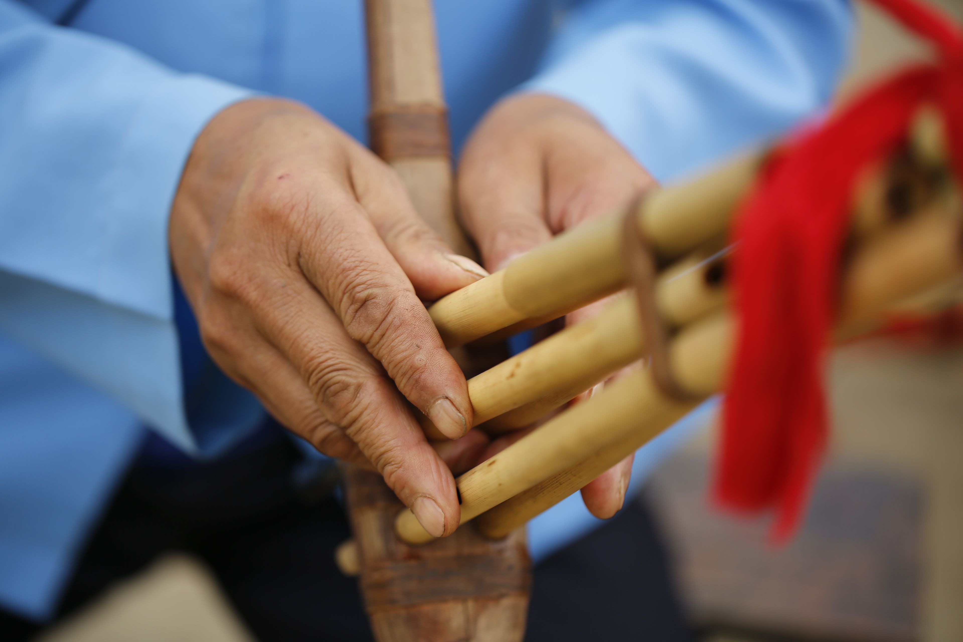 圖片名稱:貴州貴陽苗族花鼓舞傳承人鄧開倫教授他人吹奏蘆笙