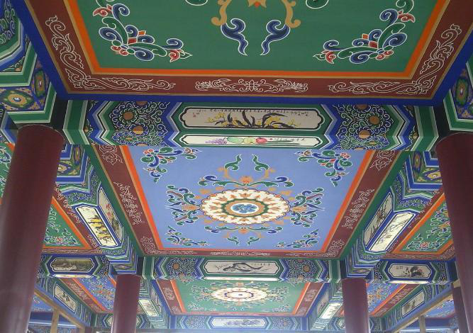 彩畫著色是一項關(guān)鍵的工序,不能有半點差錯。工匠們?yōu)椴煌伾O(shè)定了代號,一米色、二淡青、三香色、四硝紅、五粉紫、六洋綠、七佛青、八石黃、九紫色、十黑煙、十一紅等。將代號直接寫在地仗上,然后根據(jù)色號將各種色料對號入座,涂刷著色一、二遍,待干后再刷一遍光油罩光,以起保護作用。彩畫所用色料一般均為各色成品油漆。