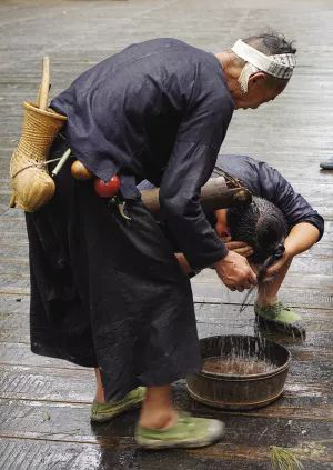 “同樣是掛在后腰的竹簍,貴州岜沙苗族漢子的竹簍則少一分嬌俏,多一分霸氣。在距離貴州黔東南苗族侗族自治州從江縣8公里的山坳上,坐落著“最后一個持槍部落”——岜沙苗寨。這里保留了古老的風(fēng)貌,男子頭挽發(fā)髻,身著亮布衣褲,佩刀扛槍。在岜沙男子手中,鐮刀除了作為勞動工具,“鐮刀剃頭”的習(xí)俗更是令人稱奇。因此,掛在腰上鐮刀簍子也就成為了當(dāng)?shù)啬行缘碾S身配件。這種竹簍呈靴形,簍身的弧度與鐮刀完美契合,如此一來,鐮刀入簍后,既不易掉出、不易劃傷,又輕巧便捷,好不威風(fēng)!”
