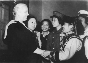 1955年9月蘇聯(lián)卓婭和舒拉的媽媽(左一)訪問(wèn)中國(guó)時(shí)接見(jiàn)中國(guó)的“瓦爾瓦娜”(蘇聯(lián)電影《鄉(xiāng)村女教師》女主角)、全國(guó)青年社會(huì)主義建設(shè)積極分子阿角(右一),時(shí)有郝建秀(左三)、徐建春(左二)同志在場(chǎng)。 資料圖片