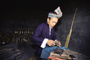 在侗族人口占78%的湖南省通道縣的牙屯堡鎮(zhèn),我們原本準備尋找會織侗錦的姑娘,卻在風雨橋上被一陣聲響吸引住了,便問當?shù)厝耍骸斑@是何聲?制樂者何人?”原來,此聲為蘆笙所發(fā),制蘆笙者為楊枝光。他制作的侗族蘆笙,因手藝出眾,在湘黔桂的侗族村寨頗有名氣。2008年6月,侗族蘆笙被列入國家級非物質文化遺產(chǎn)名錄,楊枝光榮幸地成為侗族蘆笙制作唯一的國家級“非遺”傳承人。