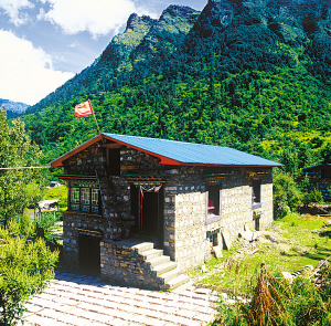 西藏自治區(qū)錯(cuò)那縣的勒布溝是門(mén)巴族聚居的地方。傳統(tǒng)民居都是依山勢(shì)而建,不規(guī)則的石頭插砌到屋頂,底墻寬厚,向上漸收,石頭間只用泥漿填縫,墻面內(nèi)外不做任何處理。室內(nèi)無(wú)柱,各樓層的樓板都是將木板、木枋插入墻體,增加了房屋的整體抗震能力,百余年無(wú)損,由此可見(jiàn)門(mén)巴族原始而高超的砌筑技術(shù)。