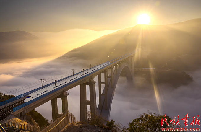 改革開放40年來(lái),少數(shù)民族和民族地區(qū)成為改革開放的切實(shí)受益者,2017年1月1日,滬昆高鐵線上的列車沐浴著新年的陽(yáng)光飛馳在云貴高原上(史家明 攝影)