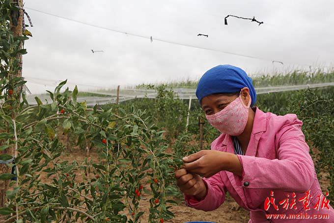 楊彩梅的二兒媳在摘枸杞,這里種植枸杞是農(nóng)戶增收的一大來(lái)源(曾穎 攝影)