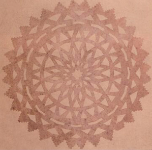 該剪紙出土于吐魯番市阿斯塔那303號墓,不僅保存完好,而且構(gòu)圖對稱、畫面均勻、線條流暢、美觀大方,可以和現(xiàn)代民間剪紙藝術(shù)相媲美。剪紙為圓形,呈土黃色,中心圖案為八角花形,依次向外為兩圈菱形花紋,交叉錯(cuò)落,排列有序;再向外圈為梯形紋組成的三角形邊飾。整個(gè)剪紙圖案層次分明,變化繁復(fù),頗有韻律感。這幅剪紙為折疊后一次剪成,造型簡潔,刀法洗練,具有古樸濃郁的民間風(fēng)格。
