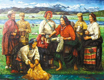 “以前畫畫時,對自己的最高要求就是畫得要逼真,把油畫畫得像一幅放大了的照片,而現(xiàn)在關(guān)注的是如何畫出能體現(xiàn)當代的畫面。西藏的美是無窮無盡的,我就想用繪畫的方式窮盡一生去追求,展現(xiàn)大美西藏?!比缃竦乃髀幔チ顺醭雒]時一味追求畫面質(zhì)感的匠氣,多了些許內(nèi)心對西藏這片熱土深層次的思考。他筆下的西藏是一片充滿生機的土地,濃墨重彩之間,既有對傳統(tǒng)和過往年華的回望和懷念,又在仿若不經(jīng)意間透過一個眼神、一抹色彩、一個小物件盡情詮釋活力和希望。