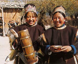 在工布地區(qū),不管是遠方的來客,還是常來常往的朋友,一踏進主人的新家,主人首先端出的是香噴噴的酥油茶。如果是尊貴的客人,還要被請到上座。招待來客時,主人會敬上酥油茶和青稞酒,尤其是青稞酒,主人要兩手棒著,恭敬地送到客人手上,客人喝一口,主人添一次,連續(xù)三次??腿俗詈笠豢跉獍驯械木坪韧辏@就是通常所說的三口一杯。如果客人推辭,主人還要獻上優(yōu)美動聽的酒歌,以此來表達主人的熱情和對客人的尊敬,直到客人把杯中的酒喝完為上。手捧酒杯,主人依次要給所有的來客敬上一遍。杯杯醇酒,盛滿了工布人的情和意。那情景,常令在場的人感動不已。