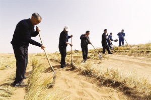 沒有治沙經(jīng)驗,他們就按“一步一叩首,一苗一瓢水”的土辦法栽種樹苗。然而,要想在沙漠中種活一棵樹談何容易?第一年,“六老漢”造林1萬畝,轉過年一開春,一場大風過后,六七成的樹苗沒了。在林業(yè)技術人員的指導下,“六老漢”重拾信心,總結出“一棵樹,一把草,壓住沙子防風掏”的治沙經(jīng)驗。慢慢地,樹苗的成活率上去了,漫天黃沙中顯現(xiàn)出點點滴滴的綠。