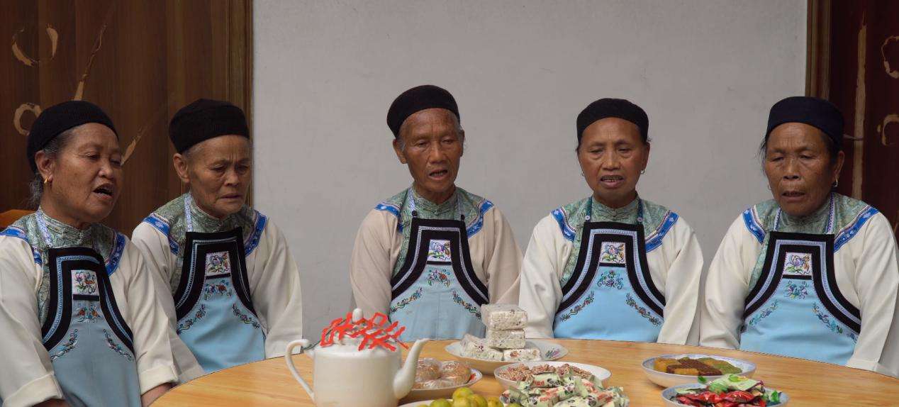 紅星村村內(nèi)布依族村民保留有布依族傳統(tǒng)服飾,在日常生活中也還有穿著布依族服飾的習慣。紅星村布依族女性服飾做工精細,款式多樣。老人頭戴黑色圓帽,上身主要穿著灰白色斜襟上衣和青藍色打底的圍腰,上衣領口至兩肩處繡有大面積花紋圖案,圍腰上部也繡有花紋圖案作為裝飾。圍腰上的兩條絲帶系于身后,絲帶上繡有花紋圖案。下身穿著灰色長褲。