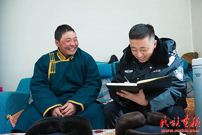 無(wú)論在哪個(gè)邊境派出所,敖日奇朗都跟牧民們以心交心,以誠(chéng)相待,成為好朋友。如今,敖日奇朗在諾門(mén)罕布日德邊防派出所工作五年了,也常有新寶力格邊防派出所轄區(qū)牧民打來(lái)電話,咨詢法律問(wèn)題,他每回都耐心地解答?!澳撩衽笥褌兊募冋尜|(zhì)樸平復(fù)了我剛到這里時(shí)躁動(dòng)的心。邊境派出所是邊民生命財(cái)產(chǎn)安全的保障,隨時(shí)為轄區(qū)群眾牽線搭橋辦事。邊防警察與牧民的良好互動(dòng),會(huì)在關(guān)鍵時(shí)刻發(fā)揮重要作用,這恰恰也是我們開(kāi)展走訪工作的意義所在?!卑饺掌胬矢锌?。