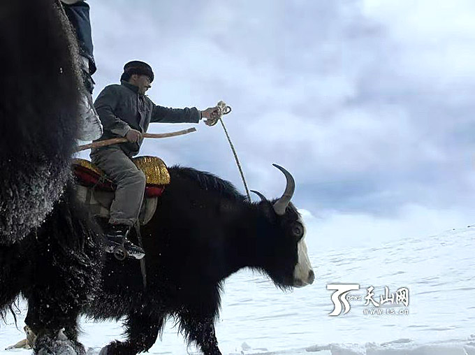 拉齊尼·巴依卡騎著牦牛行走在千里邊防線上。(潘黎明 提供)