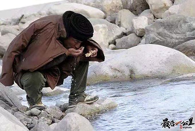 在巡邏間歇,拉齊尼·巴依卡喝著河水,吃著大馕,經(jīng)常如此。(網(wǎng)絡(luò)圖片)