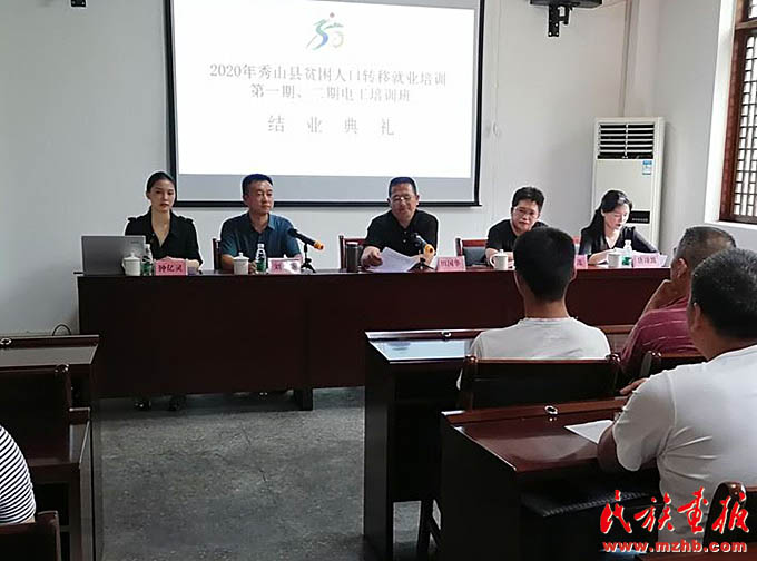 2020年6月29日,鐘億靈(左一)出席在清溪場鎮(zhèn)武陵山致富帶頭人實訓(xùn)基地舉行的秀山縣2020年貧困人口轉(zhuǎn)移就業(yè)培訓(xùn)第一、二期電工培訓(xùn)班結(jié)業(yè)典禮。(秀山縣人民政府網(wǎng))