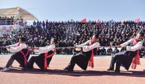2020年11月29日,為期三天的西藏自治區(qū)山南市扎囊縣首屆農(nóng)民運動會在扎囊縣體育公園進行。抱石頭、套麻袋、氆氌纏線等多項趣味十足的運動,吸引了來自扎囊縣5個鄉(xiāng)(鎮(zhèn))、62個行政村(居)的450多名農(nóng)牧民運動員參加角逐。每年冬季,雅魯藏布江流域的西藏農(nóng)村進入農(nóng)閑時期,當(dāng)?shù)剞r(nóng)牧民就迎來了一年中難得的休閑時光。圖為農(nóng)牧民運動員在進行拔河比賽。