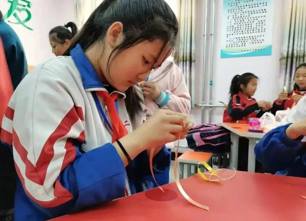 葛玉英說(shuō):”芨芨草手工編織品主要有簍、筐、盒、盤、茶墊、時(shí)尚包等生活用品,色彩以白、藍(lán)為主,圖案以白云紋、曲字紋為主,以針繡法結(jié)合草編中的平編、絞編、編花、纏邊、擰編等技法進(jìn)行編織。在實(shí)際教學(xué)中,為了方便,我用彩帶代替芨芨草,讓芨芨草編織技藝在孩子們的濃厚興趣中得到傳承,既提高了學(xué)生的動(dòng)手能力,也提升了學(xué)生的審美思維和審美能力,同時(shí)增強(qiáng)了學(xué)生對(duì)本土文化的自豪感和自信力?!?/p>