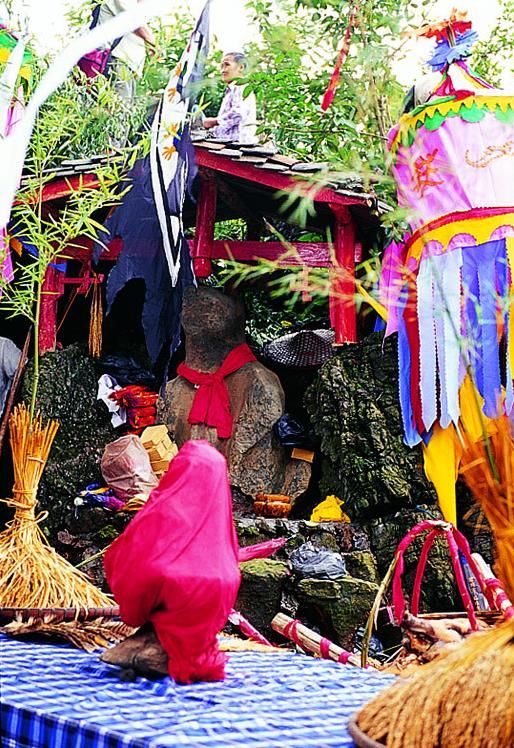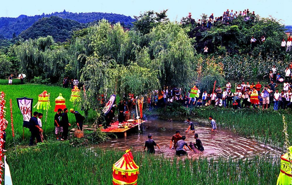 敬霞儀式在霞堂舉行。霞堂設(shè)有祭壇。壇前立著一根竹竿,竿頂上站立一只公雞。祭壇中是主祭席,其友有用松針鋪成十二個祭祀點(diǎn),由宗族各支系擺設(shè)祭品。敬霞這天,各支系由德高望眾者領(lǐng)隊(duì)。抬著豬肉、糯米飯、米酒等食品列隊(duì)進(jìn)入霞堂。一路上銅鼓、銅鑼、欽、革鼓被敲得冬嚏冬嚓地響,人們跟在后面吆喝著前進(jìn)。祭典開始,鑼鼓暄天。接著由執(zhí)壇的水書先生念讀敬霞的祝詞,內(nèi)容多為祈福禳災(zāi),期冀風(fēng)調(diào)雨順,人壽年豐之類。祝詞之后便酪酒祭之:此后,由兩個身穿白衣的小伙子抬一母豬到田壩中繞行,后面那位不時用松針刺戳豬的尾部,使它發(fā)出嗥叫聲。圍觀的人常常發(fā)出哄笑,并且盡情地用竹片屏水和撮稀泥向抬豬者灑淋過去。走過霞堂之后,抬豬者丟下母豬,故意穿進(jìn)圍觀的人群,嚇得人們四處躲避。這種逗趣結(jié)束之后,水書先生再度念讀咒詞,當(dāng)他手中的執(zhí)法彩杖一揮時,飼雞者便學(xué)雞嗚,逗引竹竿頂上的公雞啼鳴。這時,主祭者就向眾人高呼:等待霞神降雨來沐浴。此后,水書先生再念祝詞,又酹酒祭之。然后由各族系代表抬著"酒壇去澆灌"霞神"。人們用酒從頭澆到腳,一直澆到"霞神"們倒(象征酒醉)才算祭祀的成功。