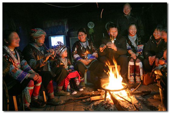 苗族起木樓很注重火塘的設(shè)置,特別留出二樓正中的大半廂作火塘?;鹛劣脤捄窭仙寄景彖傊瞥梢粋€(gè)長(zhǎng)寬約一點(diǎn)五米,深約六十公分的正方形木槽,槽內(nèi)用粘性強(qiáng)的黃泥巴填滿舂緊,正中央安放有三腳鐵架,用于架鍋煮食?;鹛潦侵蟪?、進(jìn)餐、取暖、會(huì)客、議事、祭祀的地方,又是年輕人走妹行歌、談情說(shuō)愛(ài)、舉行婚禮儀式的場(chǎng)所。因此苗家人對(duì)火塘是十分看重的。