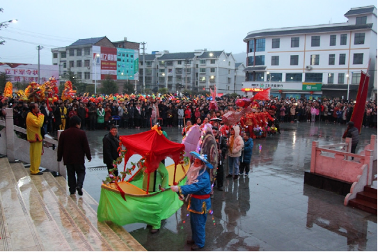 2019年2月16日農(nóng)歷正月十二是瓦寨鎮(zhèn)傳統(tǒng)大型集會活動日,舞龍為主要活動之一。午飯后,來自全縣各地的舞龍舞獅隊、花燈隊陸續(xù)到瓦寨政府廣場集結,并在廣場右側有序排隊等待,各隊隊員精神抖擻、神采飛揚、迫不及待。前來參觀元宵舞龍的群眾和游客也不斷涌向廣場,大街小巷行人猶如潮涌,吆喝聲、歡笑聲、鑼鼓聲連綿不斷……下午五時許,活動在瓦寨鎮(zhèn)政府廣場正式開始,先是由鎮(zhèn)領導對脫貧攻堅各項惠民政策及5年來瓦寨取得的攻堅戰(zhàn)績進行宣講,宣講慳鏘有力、扣人心弦,特別是5年來瓦寨取得的攻堅戰(zhàn)績,一致得到人民群眾好評和認可。隨后,舞龍、舞獅、花燈表演紛紛上演,只見黃龍時而上下翻騰,時而昂首擺尾,雄獅時而就地打滾,時而賣萌撒嬌,樣子憨態(tài)可掬,花燈表演幽默滑稽,在前行中跑出各種套路,起伏波動、生動活潑,吸引了所有人的目光,贏得了陣陣喝彩……