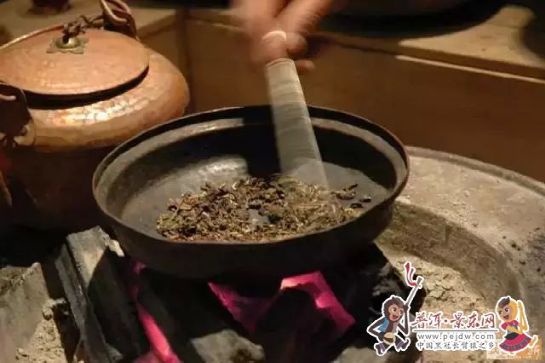 彝家糊米罐罐香茶烤罐要肚大口小,大小適中,茶具為土陶和紫砂制品為主。泡茶取無量山泉水,主要工序是用銅壺將水燒開,先將上好的糯米煎烤至黃,再將取于哀牢無量山的曬青白牙口茶放入抖烤??静钑r(shí)要求“烤關(guān)百抖”,茶葉泛香糯米焦黃,糊米和茶葉烤好后,即沖入少量沸水,讓水自動(dòng)沖除罐口浮沫,放入小片刨開的鮮姜,再加入開水煮一分鐘,即可入杯,奉給客人飲用。