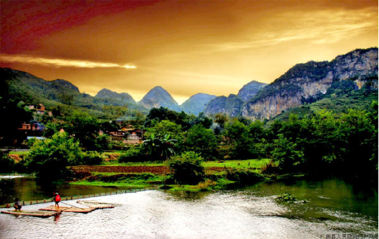 壩美,為壯語譯漢語為:壩—沖口,美—樹 ,因居住的沖口樹木多而得名。壩美村位于珠江流域西江水系馱娘江上游的阿科河畔。屬喀斯特地貌,區(qū)域內(nèi)山峰奇特,河谷幽美,阡陌縱橫,河流山泉蜿蜒奔流,溶洞層疊散布在山體峰內(nèi),冬無嚴(yán)寒,夏不酷暑,氣候宜人。因四面環(huán)山,不通公路,進出寨子主要靠村前村后兩個天然的石灰溶巖水洞,村民們要摸著巖壁趟水、撐竹筏、劃獨木舟、坐小船,經(jīng)過950米長的幽暗的“出水洞”和680米長的“湯拿洞”才能進出。由于地處偏僻,交通不便,基本不與外界交往,多年來壩美村長時期與外世隔絕。壩美村水源豐富,氣候溫和,自然生態(tài)環(huán)境未被污染,負(fù)氧離子質(zhì)數(shù)高出城市數(shù)倍,游人在此休憩,心曠神怡,是一個溫濕潤,四季宜人的旅游勝地。就生態(tài)環(huán)境和歷史淵源來說,《桃花源記》問世1500多年,只聞其名,不見其實。相傳除唐代確認(rèn)湖南省桃源縣的桃源洞為其原型外,目前全國就有冠名“世外桃源”的地名16個之多。而今天的壩美,不僅十分相似,而且還神似東晉文學(xué)家陶淵明筆下所描寫的“林盡水源,便得一山。山有小口,仿佛若有光;便舍船從口入……土地平曠,屋舍儼然,有良田美池桑竹之屬;阡陌交通,雞犬相聞……”的世外桃源。而且在當(dāng)?shù)卮迕裰杏性S多歷史傳說:北宋皇祐四年(公元1052年),壯族起義領(lǐng)袖儂智高在邕州(南寧)昆侖關(guān)被狄青打敗后,退入以其繼父儂夏卿為首領(lǐng)的特磨道(廣南)后,至和二年(1055年),宋朝廷又派楊文廣領(lǐng)兵進剿,儂智高在突出重圍轉(zhuǎn)至阿科(今廣南縣壩美鎮(zhèn)治所)與宋軍周旋,終因寡不敵眾而離開阿科轉(zhuǎn)戰(zhàn)于丘北、開遠(yuǎn)、蒙自、元江等地,后到大理不知所終。