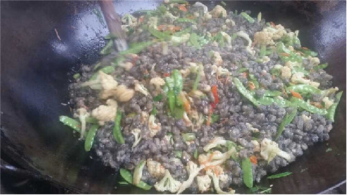 烹制蚵柳,先要挑選好個肥形大的鮮蚵,用心幾遍洗凈,再用篩細(xì)的地瓜粉薄薄拌勻,務(wù)求每只蚵仔獨立成團(tuán),再兜在漏勺里到滾開的水里焯一下即起來,再攤放有竹篩簸里晾干瀝水一個晚上。第二天中午烹制,先把油燒熱,倒入生姜末過油,再依次倒入花菜、荷蘭豆、紅蘿卜絲、芫荽等“菜腳”與鹽、雞粉、料酒、蠔油、胡椒粉、醋等佐料一并翻炒,菜蔬生汁,試嘗咸淡,再倒入已備好的蚵仔團(tuán)翻炒,只需幾下,便已熟透,即可裝盤。