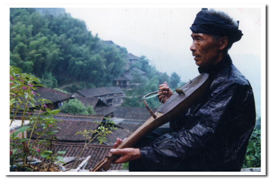 果哈是苗族唯一的古老的民間弓弦樂(lè)器,因其形似瓢,故苗語(yǔ)稱(chēng)之為果哈(意即瓢琴),是唱古歌時(shí)不可缺少的伴奏樂(lè)器,一般以歌師自拉自唱為主。制作工藝比較粗糙,先選一段長(zhǎng)60厘米、直徑為15厘米左右的鴨腳木或泡桐木制成琴身,在其二分之一的一端剜成瓢狀,封住薄板作共鳴箱。另一端修成琴柄,在琴柄頂端鉆孔安琴鈕,用棕繩、牛筋作琴弦,用竹片和綜絲制成弓。琴置兩弦,演奏時(shí)以人的唾液代替松香,演奏者時(shí)而將弓毛放入口中,讓弓毛增加溫度,增強(qiáng)與琴弦的磨擦,使之發(fā)音。果哈音量微弱,發(fā)音低沉,但音色獨(dú)特,與苗歌語(yǔ)調(diào)相當(dāng)協(xié)調(diào),較適合表現(xiàn)安靜、深沉情緒,故常為苗族敘事古歌伴奏。