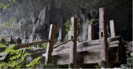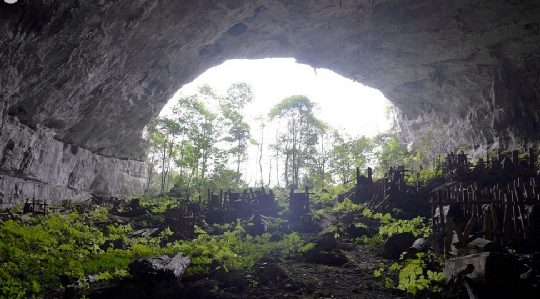 果里巖洞葬位于貴州龍里縣擺省鄉(xiāng)果里村東1公里煤洞坡的洞穴中,地處巖溶山原,峰叢林立,喬灌間雜。該洞在山頂下四十米處呈南北向橫穿山體,長(zhǎng)580米,寬為38—65米,高為21—50米,有兩個(gè)入口;北面入口,寬54米,高21米,;南面入口,寬35米,高45米,有三道石砌墻垣。洞中地勢(shì)內(nèi)斜平緩,洞內(nèi)干燥,能見度好,入口處地勢(shì)外斜。據(jù)查,果里的苗族于明朝初期從貴陽(yáng)遷徙而來。從遷徙之初至清末,他們均習(xí)慣將亡者殮于棺木集中存放在洞穴之內(nèi)。在洞穴北面入口3000平方米的范圍內(nèi)現(xiàn)存完好的棺木有192具,腐朽散落及其它原因損毀的約200余具。棺木材質(zhì)為杉木。棺木有平板平頭和鼓型雄頭之分,其大小因亡者的體型而定。平板平頭型棺木制作粗糙,長(zhǎng)1.45—2.23米,寬0.46—0.75米,高0.46——0.9米;鼓型雄頭棺木多為杉木本色,長(zhǎng)1.5—2.23米,寬0.48—0.8米,高0.5—0.9米。棺木一律頭向北面入口,均固定于兩個(gè)或三個(gè)“井”字架上;三個(gè)“井”字架表明亡者為男性,兩個(gè)“井”字架的為女性。棺內(nèi)亡者頭靠凹型木枕。平板平頭棺為明代,鼓型雄頭棺為清代。