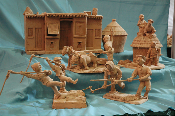 泥塑藝術(shù)是我國一種古老常見的民間藝術(shù)。它以泥土為原料,以手工捏制成形,或素或彩,以人物、動物為主。不同的民間風(fēng)俗,流傳著很多動人的傳說故事,這些構(gòu)成了泥塑藝術(shù)的精神內(nèi)核。民間泥塑的用途主要有祈子延壽、納福招財、驅(qū)邪避災(zāi)和裝飾擺設(shè)等。泥塑成本低,費(fèi)工少,是老百姓喜聞樂見的藝術(shù)表現(xiàn)形式,它往往和節(jié)令、禮儀、風(fēng)俗聯(lián)系在一起,反映的是當(dāng)?shù)剞r(nóng)村人們?nèi)粘I畹牟煌瑘鼍?,人物栩栩如生,場景鮮活生動。