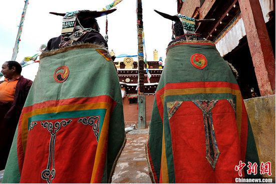 盡管歷史悠久,但它并沒有隨著時光的流逝和時代的變遷而被束之高閣,實際上,即便是今天,這些服飾仍然是當(dāng)?shù)刂匾淖诮袒顒又斜夭豢缮俚膬?nèi)容,在科迦寺每年藏歷1月12日大譯師仁青桑布建成108座殿堂和寺廟的慶功紀(jì)念日上,科迦村有這套服飾的7戶家庭的婦女都要穿上這套服飾在科迦寺僧人跳神舞的間隙表演宣舞。
