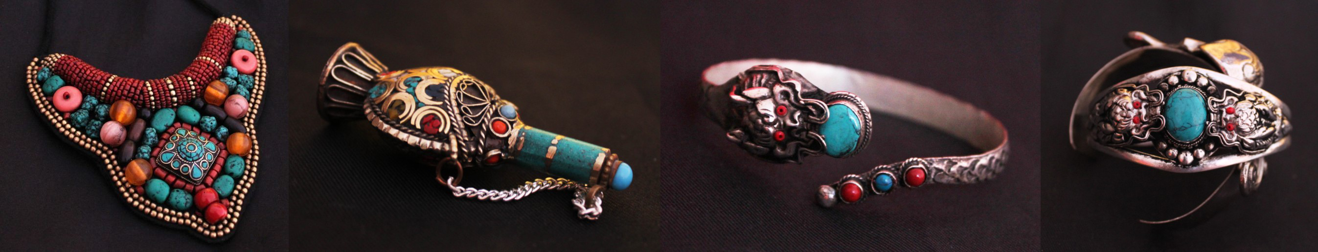 天然石頭、珊瑚、動(dòng)物骨頭、白銀是制作藏飾的主要原料,就是這些平實(shí)的材料,粗糙的外表卻有精致的內(nèi)涵。細(xì)小的花紋、鏤刻、鑲嵌,都巧妙地形式藏飾的設(shè)計(jì)風(fēng)格,并散發(fā)出濃烈的古、土味。所有藏飾均是手工完成,好多藏飾是喇嘛在廟里打造出來的,每一件都是與眾不同。