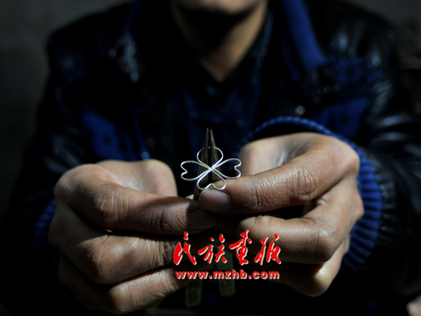 順著龍?zhí)?yáng)的手勢(shì)看去,大鵬展翅之雄鷹赫然出現(xiàn)在我的眼前,羽片一閃一閃,形態(tài)十分逼真。據(jù)說(shuō)曾有外國(guó)游客出價(jià)2萬(wàn)元想買(mǎi)走,但被他婉拒。成本只有幾千元的銀料卻能賣(mài)到2萬(wàn)元以上,足見(jiàn)這件作品的做工和創(chuàng)意。
