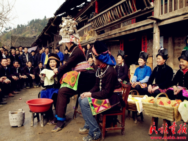 第二天是新娘出嫁的日子。早上七點,新娘的姑嫂和姐妹就早早地來到新娘家為新娘梳妝打扮,有的給新娘梳頭,有的給新娘穿衣,有的給新娘佩帶銀飾,女孩子們唧唧喳喳一陣熱鬧。經(jīng)過一個多小時的梳妝打扮,新娘就要出門了。