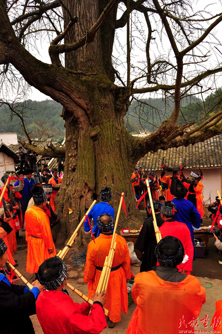寨老引領(lǐng)眾人來(lái)到寨中央的千年銀杏樹(shù)下進(jìn)行祭樹(shù),寨老高舉牛角、男人們吹起蘆笙圍著古樹(shù)轉(zhuǎn)圈,司儀唱起“古歌”祈禱