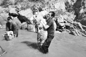 筆者曾在四川省涼山州金陽縣依達鄉(xiāng)嘎格達村看見一群綿羊被圍在小河旁,兩個中年男子在給綿羊“洗澡”,原來是要準備剪羊毛了。