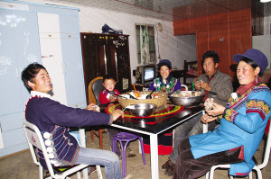 用上裝飾著彝族傳統(tǒng)紋飾的餐桌和板凳,開心地吃起坨坨肉。俄底爾以攝