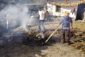 彝家人褪豬毛的方式比較獨(dú)特,不使用開水沖燙,而是把豬放在草堆上用火燒,然后再用刀刮去豬毛。草堆被點(diǎn)燃后,豬肉的香氣便彌漫在空氣里。