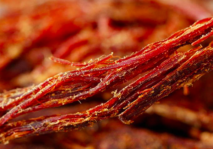 5、捶:將刮干凈的干巴置于砧板,用特制的木捶四周捶,用力要猛,要準(zhǔn),同時(shí)要注意安全,捶數(shù)下,待干巴的呈細(xì)絲狀,取出。