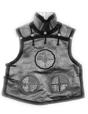 坎肩,又稱背心、馬甲。巴圖魯坎肩是京師八旗旗人最時尚的一種款式,其樣式是在“一字形”的前襟上裝有排扣,兩邊腋下也有紐扣。“巴圖魯” 一詞源自少數(shù)民族語,是我國北方某些民族專門賜給強(qiáng)悍勇士們的美稱。 巴圖魯坎肩源于蒙古族杜爾伯特部男子穿兩邊有衩的大襟短坎肩。早先有27道扣袢兒,胸前9道扣袢兒,兩側(cè)各9道扣袢兒,后來變成胸前9道,兩側(cè)各7道扣袢兒,以白色綢緞為面料,以青色綢緞為沿邊兒。巴圖魯坎肩從前是兵卒之服,早先在面料和里子之間安放魚鱗式薄鐵片,作為保護(hù)身體的甲片。
