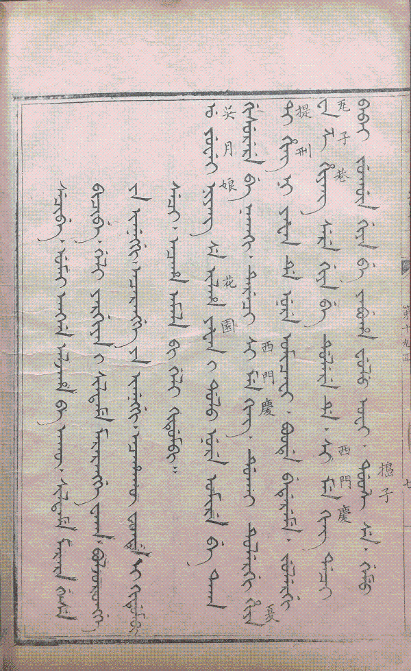 滿文本《金瓶梅》國(guó)內(nèi)藏有國(guó)家圖書館刊本、中央民族大學(xué)圖書館刊本、趙則誠先生藏刊本(殘)、中國(guó)社科院民族研究所刊本(殘)、大連圖書館抄本、吉林大學(xué)圖書館精抄本、中國(guó)民族圖書館刻本等。此外北平闞君云敝處所藏有蒙文《金瓶梅》。