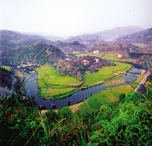 侗家人聚族而居,多是一姓一寨,或幾戶同寨,但分片而居。村寨多建于有河流的山腳下,榕樹參天、群山環(huán)抱、流水潺潺,寨邊風(fēng)雨橋橫跨村頭寨腳的溪流之上。寨內(nèi)鼓樓聳立,干欄式木樓廊檐相接,鱗次櫛比,加上侗族人擅長(zhǎng)用水車提水種植水稻,登高望去,真是一派山明水秀的田園景象。