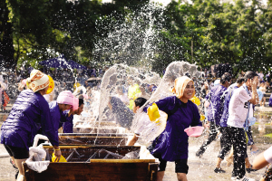 “扁水”是當?shù)胤窖?,為戲水、潑水之意。“扁水”狂歡節(jié)源于侗族“為也”習俗,為做客之意,指村寨之間村民們的互相訪問,是當?shù)匾?guī)模最大的社交和娛樂活動?!盀橐病睍r,當?shù)囟弊迦罕姂蛩?、潑水狂歡,久而久之就形成了“扁水”狂歡節(jié)。