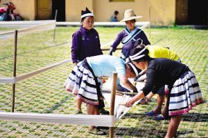 跑紗。白褲瑤的婦女們是天生的藝術(shù)家,女子要學(xué)會(huì)一整套的制作工藝??棽记?,先把紗線(xiàn)理好繞成捆。大多是幾個(gè)鄰居互相幫忙才能完成。在跑紗過(guò)程中,也是婦女們交流技藝、聊家長(zhǎng)里短的開(kāi)心時(shí)刻。2014年5月拍攝。