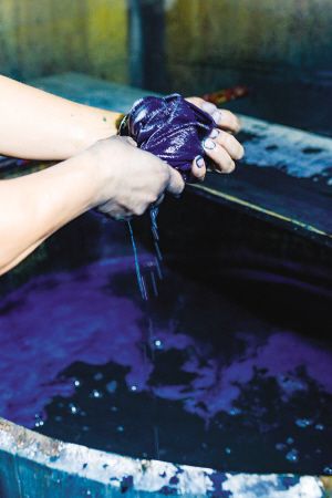 藍(lán)靛染布是一項(xiàng)古老的工藝,是白褲瑤服飾文化的重要組成部分。白褲瑤婦女用藍(lán)靛草來(lái)提取染布用的靛泥,隨時(shí)染藍(lán)、青棉線(xiàn)和青布??p制衣物的白棉布用藍(lán)靛這種天然染料染色,其色澤與一般的機(jī)織布印染有所不同。2018年8月拍攝。