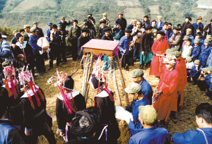 “跳五臺”可算是儀式中較為引人注目的。在村邊的一塊場地中央搭好一座約兩米高的木臺,叫做“五臺”。受戒的弟子們同樣帶著草帽,身穿紅袍,由師父帶領走向五臺。在鑼鼓聲中,繞五臺三圈,繞畢盤腿坐好。師傅叫到誰,誰就起來,在師父的指引下,沿木梯爬上高臺。蹲在五臺上的受戒者,雙手十指交錯,小心翼翼地向后移動到桌邊,然后翻落于藤網之中,由網中的棉被將受戒者包住。師父掀開棉被,見受戒者十指仍然穩(wěn)扣,坐像端端正正,表示度戒成功。十幾位弟子輪番上臺,每位都順利通過。受戒弟子的父母和鄉(xiāng)親們都為他們的成功而歡喜。