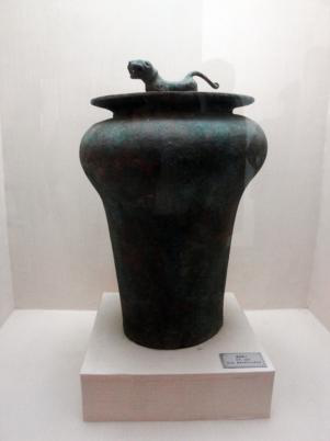 為巴文化最具代表性的青銅樂器,高68cm,上徑36cm,底徑28cm,重30公斤。1989年夏,萬州甘寧鄉(xiāng)發(fā)大水,錞于從紅旗水庫泄洪道巨石縫中被發(fā)現(xiàn),由萬州博物館收藏。2005年6月,調(diào)集到重慶中國三峽博物館。這件錞于屬戰(zhàn)國晚期的巴人作品,其通體完整,音質(zhì)優(yōu)良,造型厚重,形體特大,有“錞于王”之譽(yù)。其上部的鈕作虎形,栩栩如生,不怒而威,虎腿以漩紋勾畫出神物特征,是巴人虎崇拜的又一重要例證。虎鈕的周圍,分布著五組“圖語”:椎髻人面、羽人擊鼓與獨(dú)木舟、魚與勾連云紋、手心紋、神鳥與四蒂紋。這些圖語對研究巴文化是極為重要的資料,其中羽人擊鼓與獨(dú)木舟已經(jīng)被選取為重慶中國三峽博物館外墻浮雕的中心圖案(戰(zhàn)國青銅虎鈕錞于圖片由老鐵提供)。