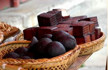 逢年過(guò)節(jié)或來(lái)了至親好友、土家人的餐桌上往往會(huì)擺上一碗血豆腐。血豆腐是土家族傳統(tǒng)菜。用新鮮的豆腐加上干凈的豬血,拌以食鹽、辣椒、花椒、桔皮、肥肉末,用手捏成塊狀,放在柴草煙上熏烤,以表面稍黑,內(nèi)質(zhì)稍硬為度。食用時(shí)可以切成薄片,加以豬肉爆炒,也可以切成細(xì)絲,加上辣椒、香蔥炒制。入口時(shí),令人覺(jué)得清香酥軟,大開胃口,是一道下酒佐食的佳肴。