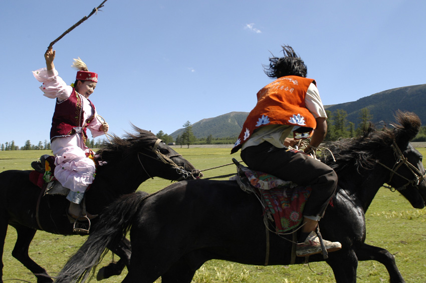 哈薩克族喜聞樂見、世代相傳的體育娛樂活動有很多,其中具有代表性的主要有姑娘追、叼羊、賽馬、摔跤、馬上摔跤、騎馬搶布、騎馬拾銀元、馬上角力、馬上射箭等饒有趣味的體育娛樂活動。這些活動一般都在喜慶節(jié)日上集體進(jìn)行,充分體現(xiàn)了哈薩克族勤勞勇敢、機(jī)智聰明、剽悍粗獷的民族特點(diǎn)。與此同時,這些體育娛樂活動也是哈薩克族世代相傳的強(qiáng)身健體的方式與手段,也是哈薩克族群眾喜聞樂見的傳統(tǒng)的民間體育娛樂活動。