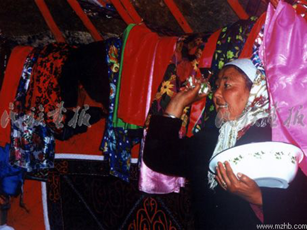 新婚喜宴開始的時候,客人先按照哈薩克人的習(xí)慣洗手,用主人準備的毛巾擦手,然后,按年齡的長幼圍坐在地氈上。主人把油炸的包爾沙克,香噴噴的手扒肉,色、香、味俱全的抓飯一盆接一盆地端來。吃完這些,大盆的肉湯或馬奶端到客人面前。哈薩克人對馬奶有著特殊的感情,他們喝完一碗又一碗,興高采烈,眉飛色舞。