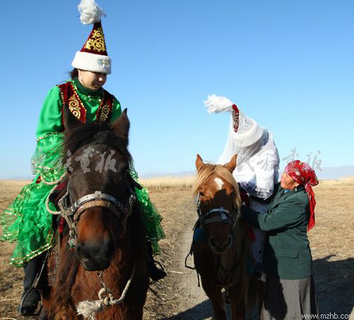 新娘唱完“闊爾斯”后,在伴娘的攙扶下,和親人們一一擁抱,揮淚告別。新娘離家時,彩巾蒙頭,出門吻別父母,騎上最快最好的馬,同新郎并駕而行。遇有攔路的繩索,新娘必須下馬,向攔路的小伙子贈送紀念品,否則,小伙子們會故意取鬧不放行。
